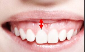 ガミースマイルの基準(定義)としては、笑ったときの上唇のラインと上顎中切歯(上アゴの中心の前歯)の歯頚部(歯と歯茎の境目⇒「スマイルライン」と言います)からの距離が約3㎜以上見えるとガミースマイルと言われています。