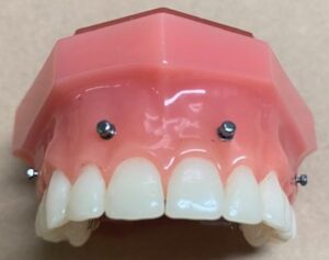 このアンカースクリューは、上アゴ前歯の歯根(歯の根)の先端付近に埋入し、そこから矯正装置のワイヤー部分にゴムを持続的にかけて引いていきます。軽度、中等度のガミースマイルは、矯正用アンカースクリューを併用したワイヤー矯正で十分に治るかと思います。